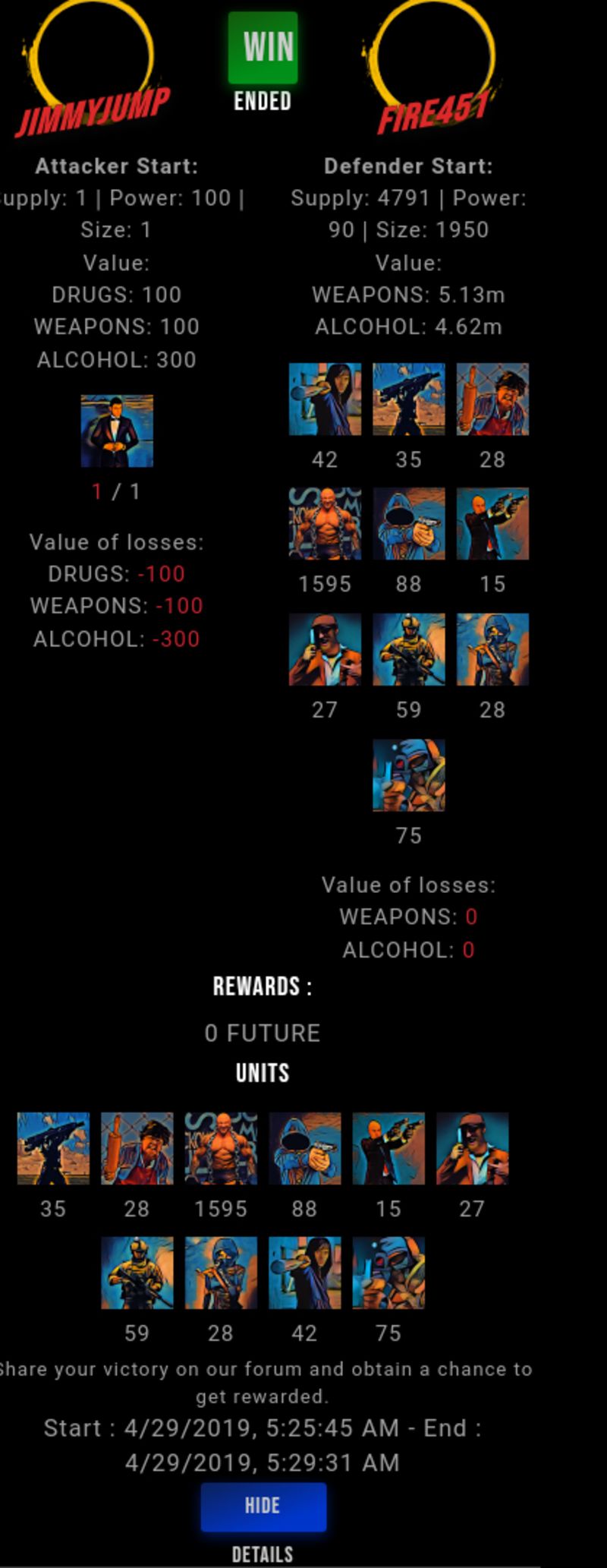 Congratulations @fire451 ! Your fight received an upvote of 0.5% from the King Dealer as incentive for your activity and as a gratitude for your support to the game.