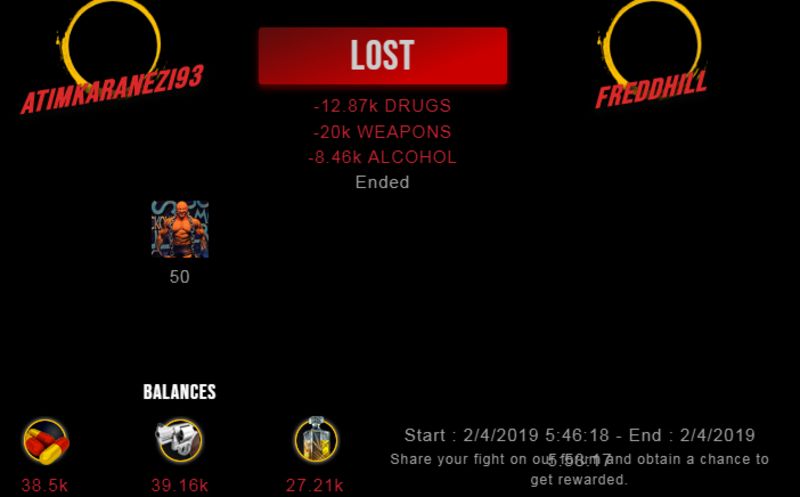 Check my latest fight ! atimkaranezi93 vs freddhillfreddhill (41)in #drugwars-fight • 7 years ago #gaming #fight #dw