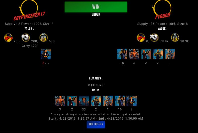 Congratulations @ftouch ! Your fight received an upvote of 5% from the Dealer as incentive for your activity and as a gratitude for your support to the game.