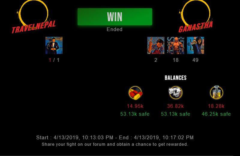 Check my latest fight ! travelnepal vs ganasthaganastha (45)in #drugwars-fight • 7 years ago #gaming #fight #dw