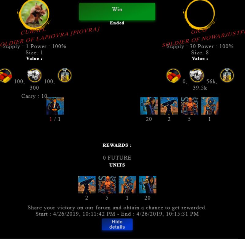 Congratulations @gico ! Your fight received an upvote of 6% from the Dealer as incentive for your activity and as a gratitude for your support to the game.
