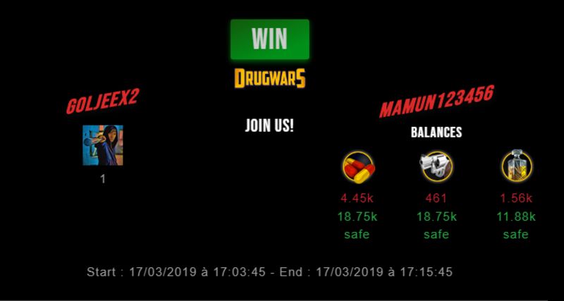 Check my latest fight ! goljeex2 vs mamun123456goljeex2 (38)in #drugwars-fight • 7 years ago #gaming #fight #dw