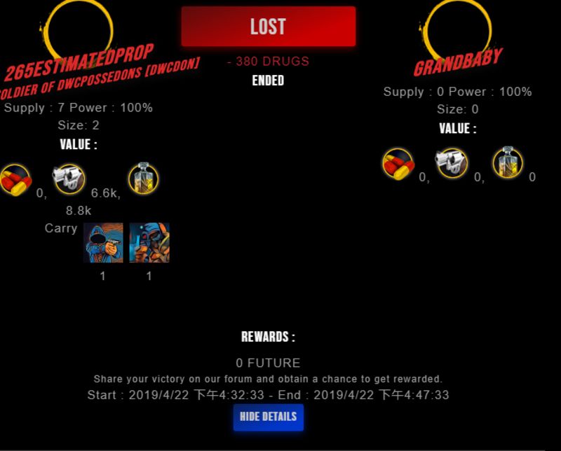 Check my latest fight ! 265estimatedpr0p vs grandbabygrandbaby (27)in #drugwars-fight • 7 years ago #gaming #fight #dw