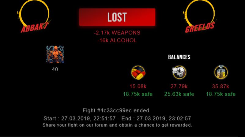 Check my latest fight ! abbak7 vs greelosgreelos (37)in #drugwars-fight • 7 years ago (edited) Trochę mnie ograbili, ale powoli bez inwestycji się rozwijam. Widzę kilka zmian zaszło w grze i mechanizm walki się w końcu zmienił ;p #gaming #fight #dw
