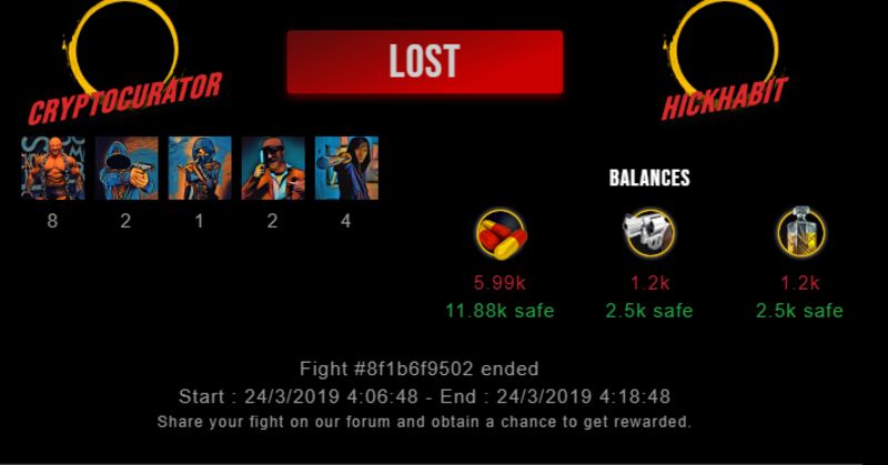 Check my latest fight ! cryptocurator vs hickhabithickhabit (25)in #drugwars-fight • 7 years ago #gaming #fight #dw
