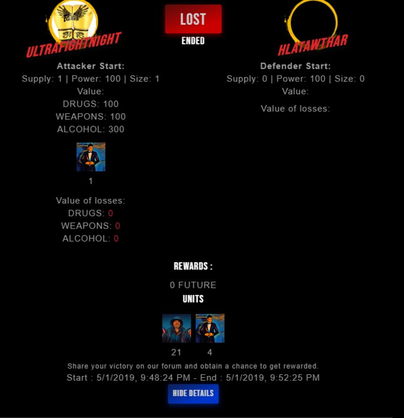Check my latest fight ! ultrafightnight vs hlatawtharhlatawthar (38)in #drugwars-fight • 7 years ago #gaming #fight #dw