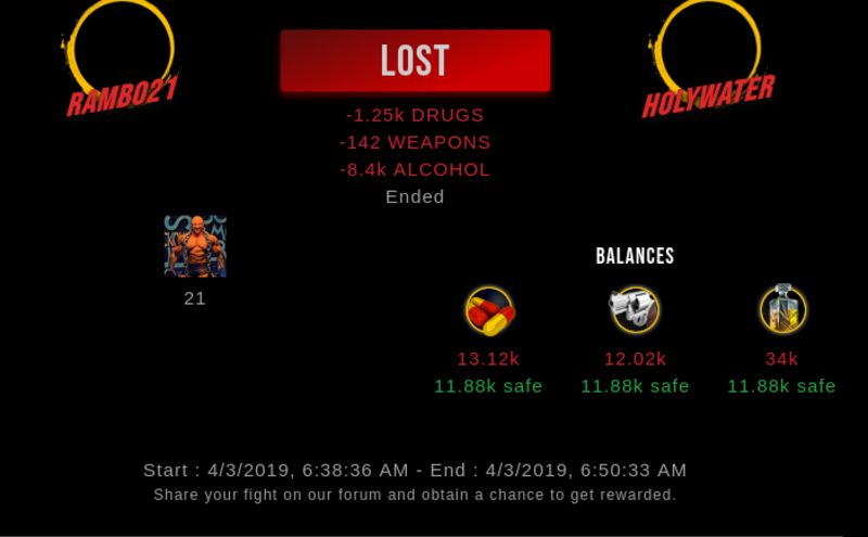 Check my latest fight ! rambo21 vs holywaterholywater (25)in #drugwars-fight • 7 years ago #gaming #fight #dw
