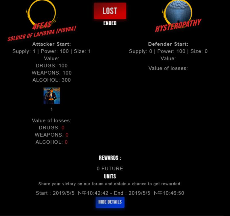 Congratulations @hysteropathy ! Your fight received an upvote of 10% from the Dealer as incentive for your activity and as a gratitude for your support to the game.