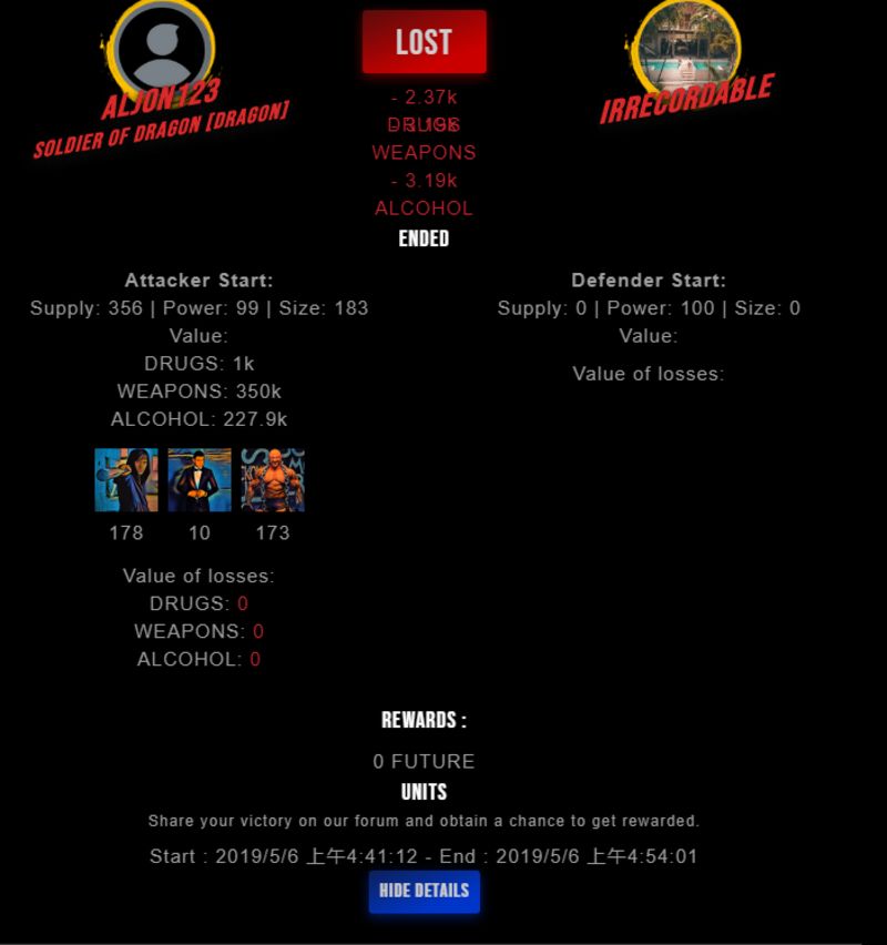 Congratulations @irrecordable ! Your fight received an upvote of 10% from the Dealer as incentive for your activity and as a gratitude for your support to the game.
