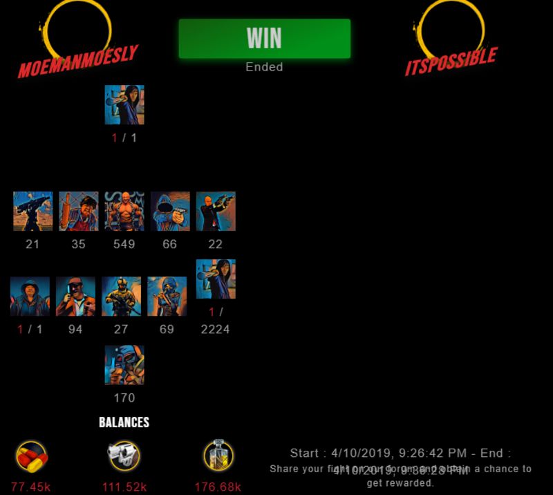 Congratulations @itspossible ! Your fight received an upvote of 2.5% from the King Dealer as incentive for your activity and as a gratitude for your support to the game.