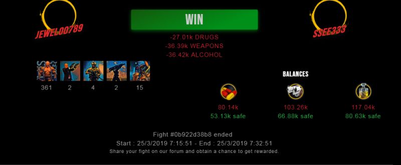 Check my latest fight ! jewel00789 vs ssee333jewel00789 (42)in #drugwars-fight • 7 years ago #gaming #fight #dw