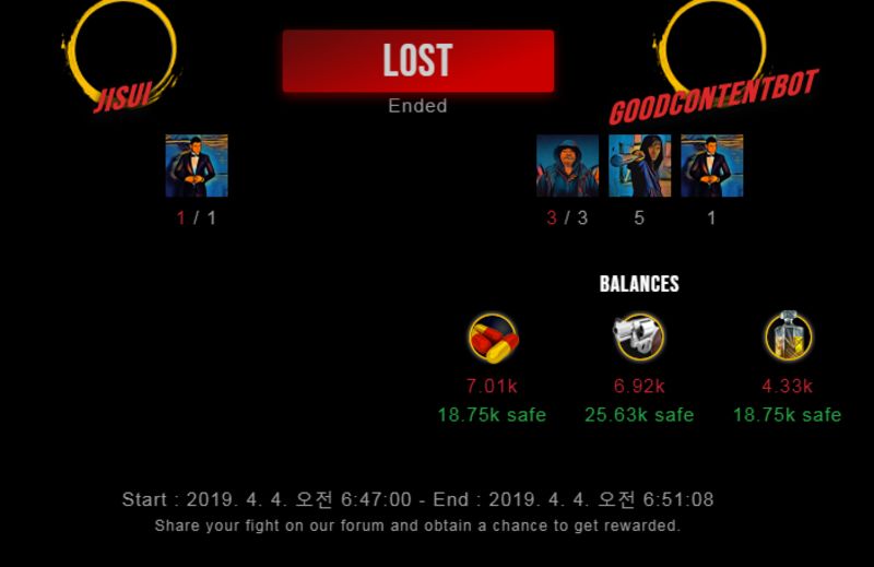 Congratulations @jisui ! Your fight received an upvote of 2.2% from the King Dealer as incentive for your activity and as a gratitude for your support to the game.