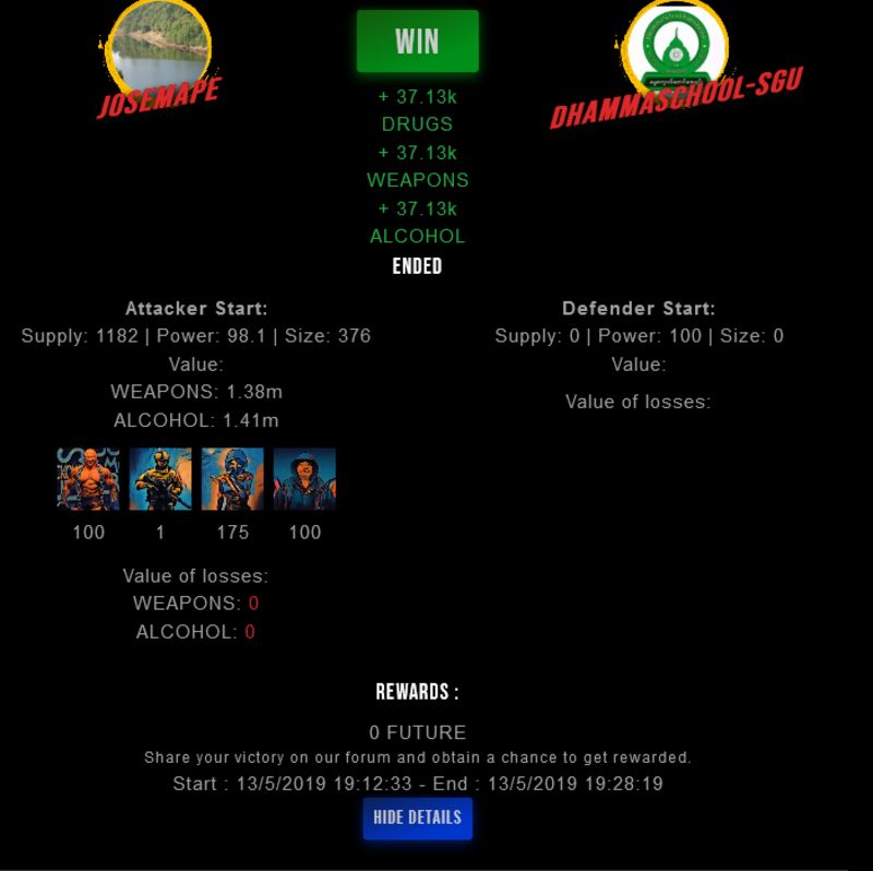 Check my latest fight ! josemape vs dhammaschool-sgujosemape (56)in #drugwars-fight • 7 years ago #gaming #fight #dw