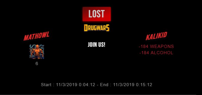 Check my latest fight ! mathowl vs kalikidkalikid (25)in #drugwars-fight • 7 years ago #gaming #fight #dw