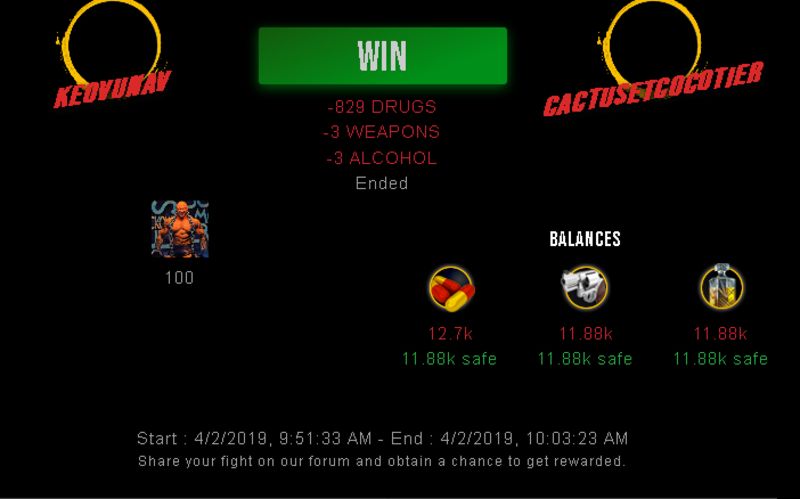 Check my latest fight ! keovunav vs cactusetcocotierkeovunav (52)in #drugwars-fight • 7 years ago #gaming #fight #dw