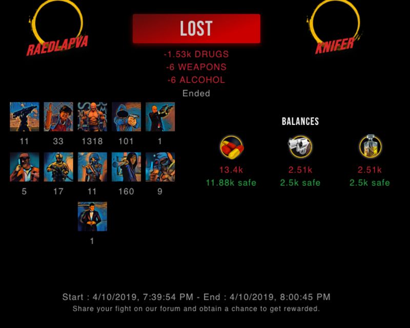 Check my latest fight ! raedlapva vs kniferknifer (50)in #drugwars-fight • 7 years ago #gaming #fight #dw