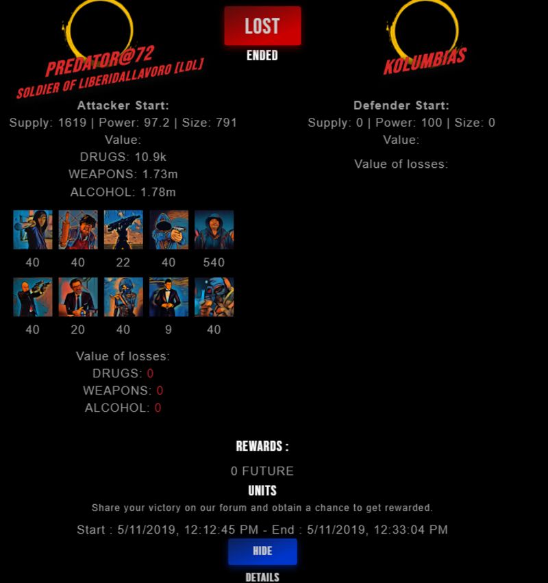 Congratulations @kolumbias ! Your fight received an upvote of 2% from the King Dealer as incentive for your activity and as a gratitude for your support to the game.