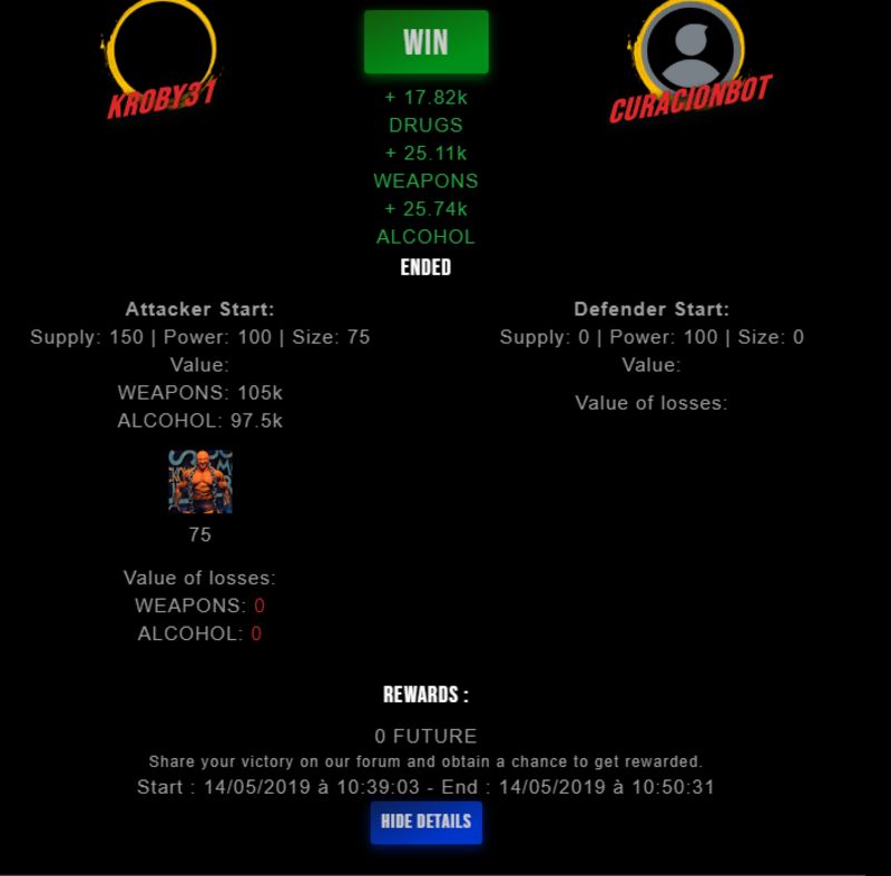 Check my latest fight ! kroby31 vs curacionbotkroby31 (60)in #drugwars-fight • 7 years ago #gaming #fight #dw