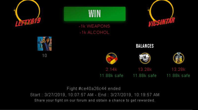 Check my latest fight ! lefty619 vs vicsintarlefty619 (58)in #drugwars-fight • 7 years ago #gaming #fight #dw