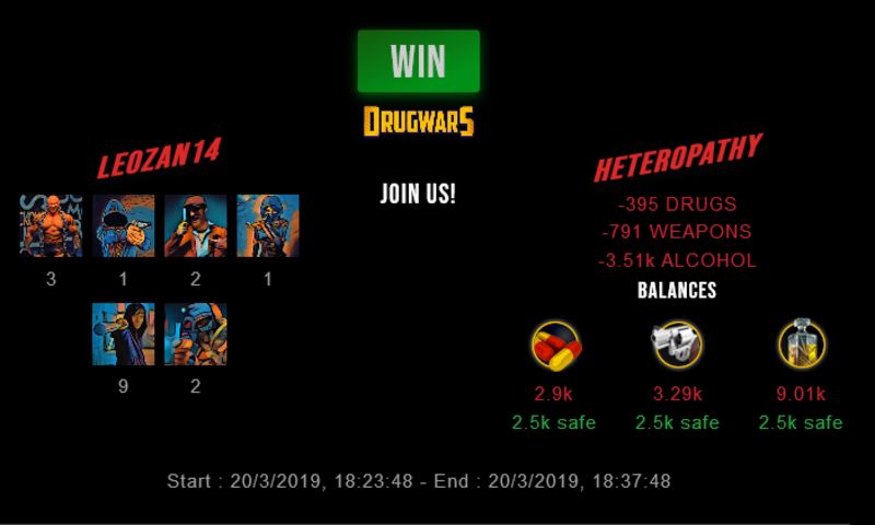 Check my latest fight ! leozan14 vs heteropathyleozan14 (42)in #drugwars-fight • 7 years ago #gaming #fight #dw