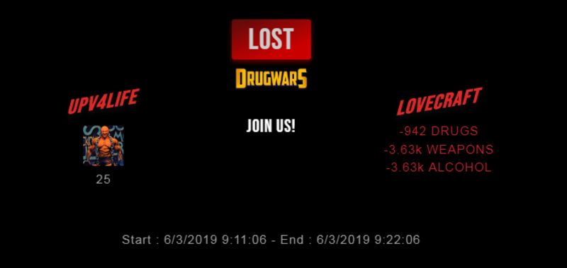 Check my latest fight ! upv4life vs lovecraftlovecraft (25)in #drugwars-fight • 7 years ago #gaming #fight #dw