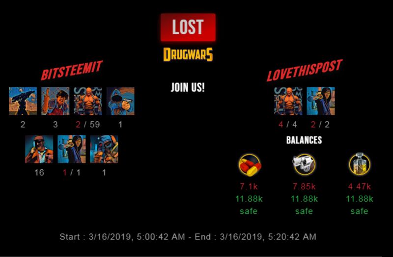 Check my latest fight ! bitsteemit vs lovethispostlovethispost (50)in #drugwars-fight • 7 years ago #gaming #fight #dw