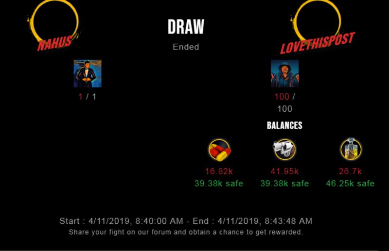 Check my latest fight ! nahus vs lovethispostlovethispost (50)in #drugwars-fight • 7 years ago #gaming #fight #dw