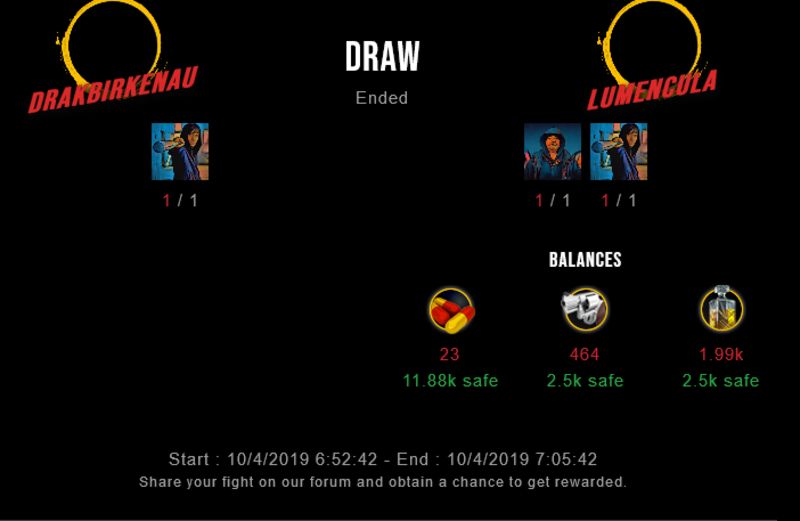 Check my latest fight ! drakbirkenau vs lumenculalumencula (47)in #drugwars-fight • 7 years ago #gaming #fight #dw