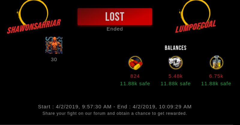 Congratulations @lumpofcoal ! Your fight received an upvote of 5% from the Dealer as incentive for your activity and as a gratitude for your support to the game.