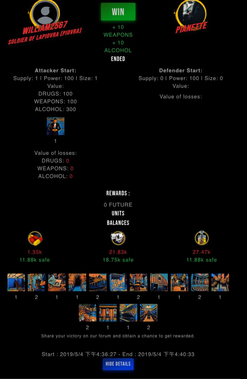 Check my latest fight ! william2567 vs pianettem15197972567 (57)in #drugwars-fight • 7 years ago #gaming #fight #dw
