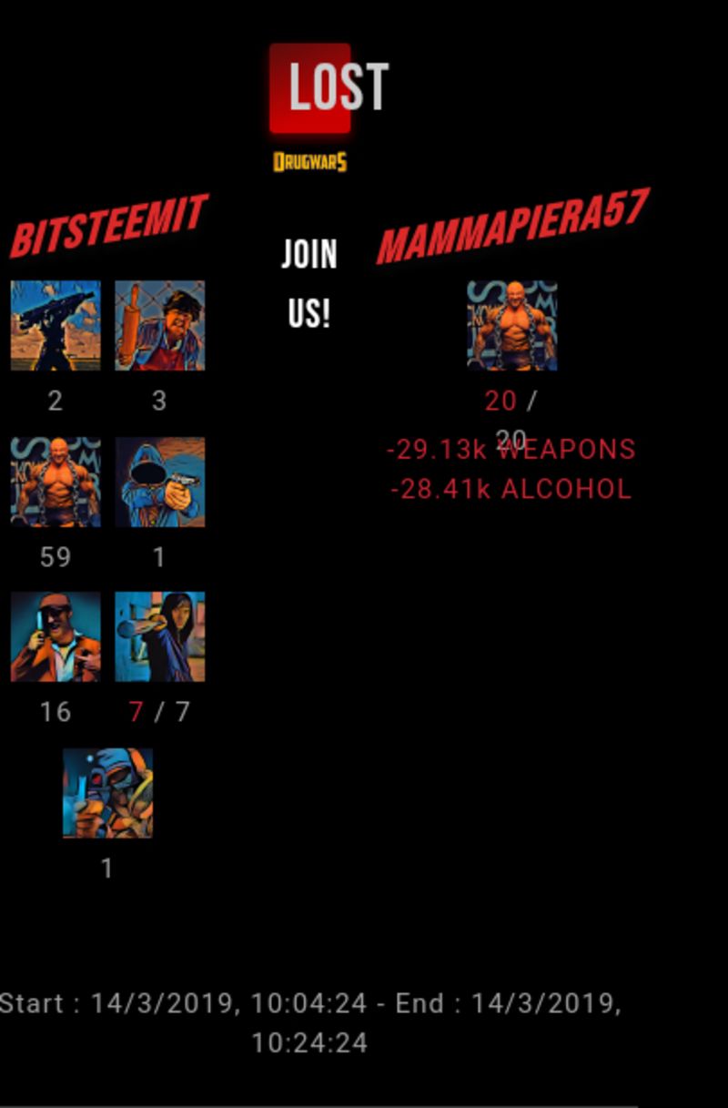Check my latest fight ! bitsteemit vs mammapiera57mammapiera57 (45)in #drugwars-fight • 7 years ago #gaming #fight #dw
