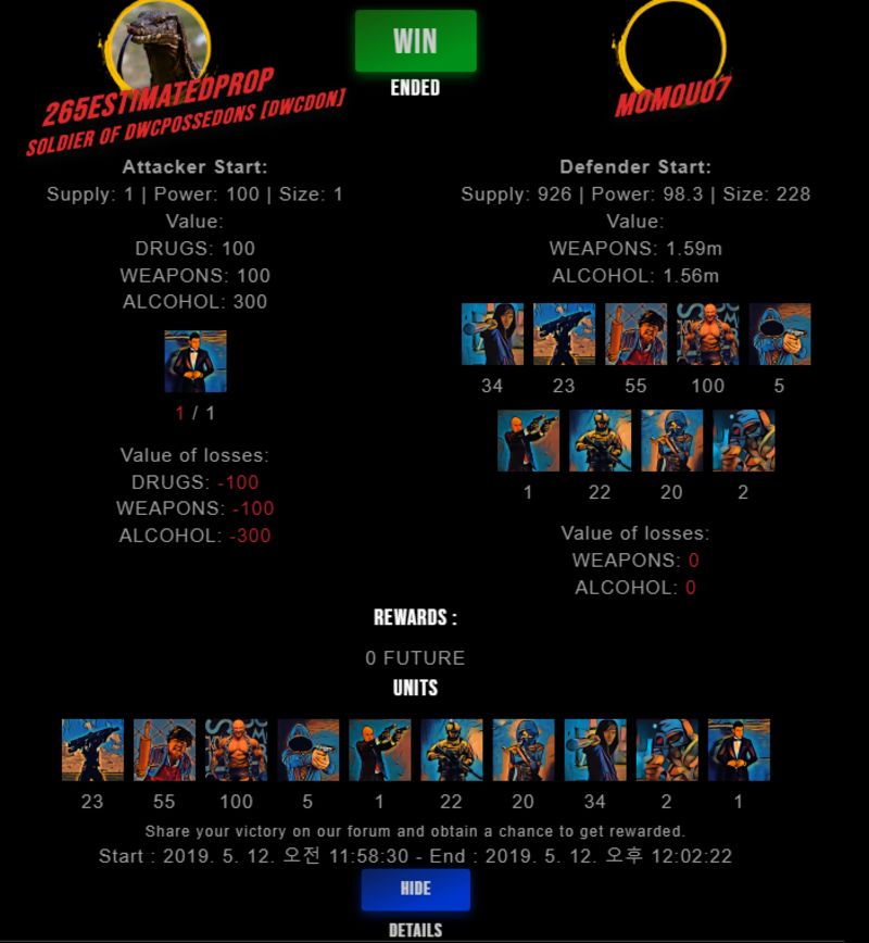 Check my latest fight ! 265estimatedpr0p vs momou07momou07 (44)in #drugwars-fight • 7 years ago #gaming #fight #dw