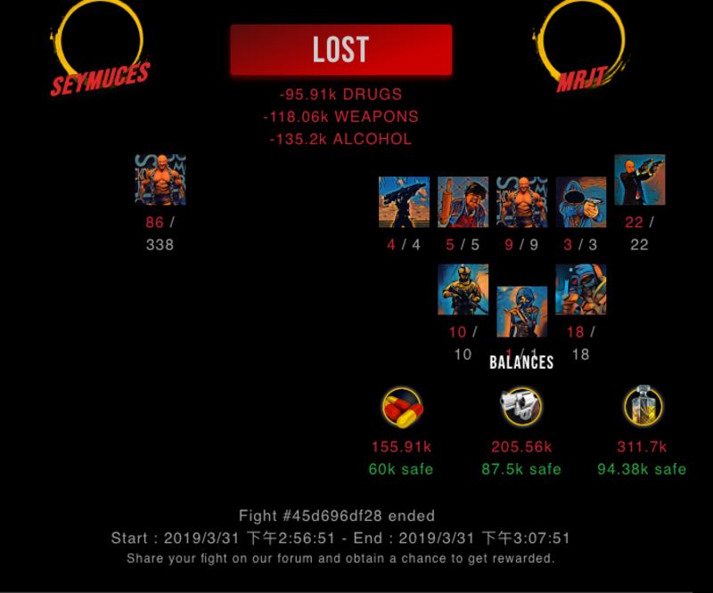 Check my latest fight ! seymuces vs mrjtmrjt (53)in #drugwars-fight • 7 years ago (edited) 我屌。。。。 清袋 #gaming #fight #dw