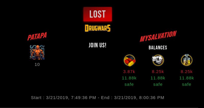 Check my latest fight ! patapa vs mysalvationmysalvation (25)in #drugwars-fight • 7 years ago #gaming #fight #dw