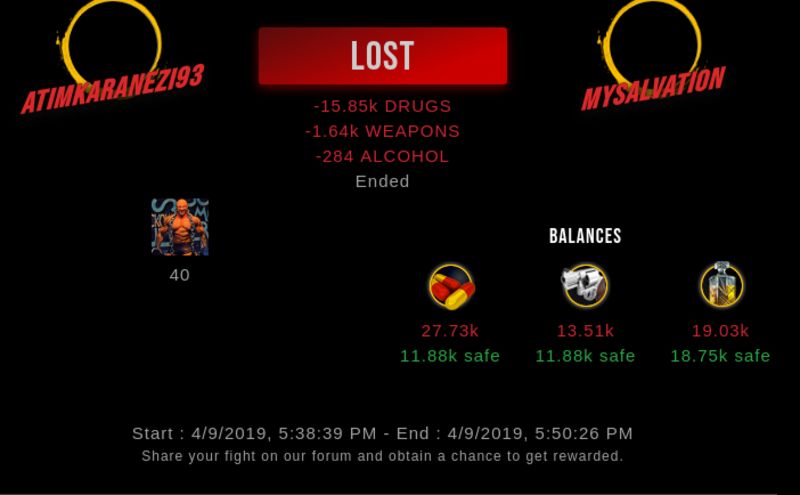 Check my latest fight ! atimkaranezi93 vs mysalvationmysalvation (25)in #drugwars-fight • 7 years ago #gaming #fight #dw