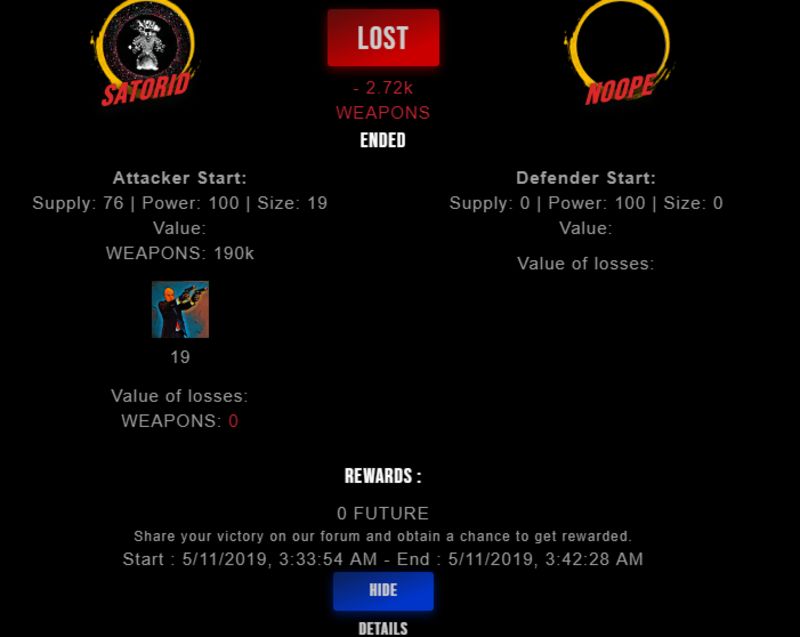 Congratulations @noope ! Your fight received an upvote of 2.1% from the King Dealer as incentive for your activity and as a gratitude for your support to the game.