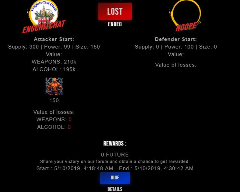 Congratulations @noope ! Your fight received an upvote of 2.1% from the King Dealer as incentive for your activity and as a gratitude for your support to the game.