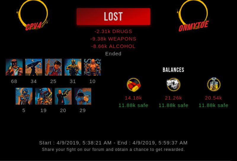 Check my latest fight ! cpv4 vs onmytoeonmytoe (25)in #drugwars-fight • 7 years ago #gaming #fight #dw
