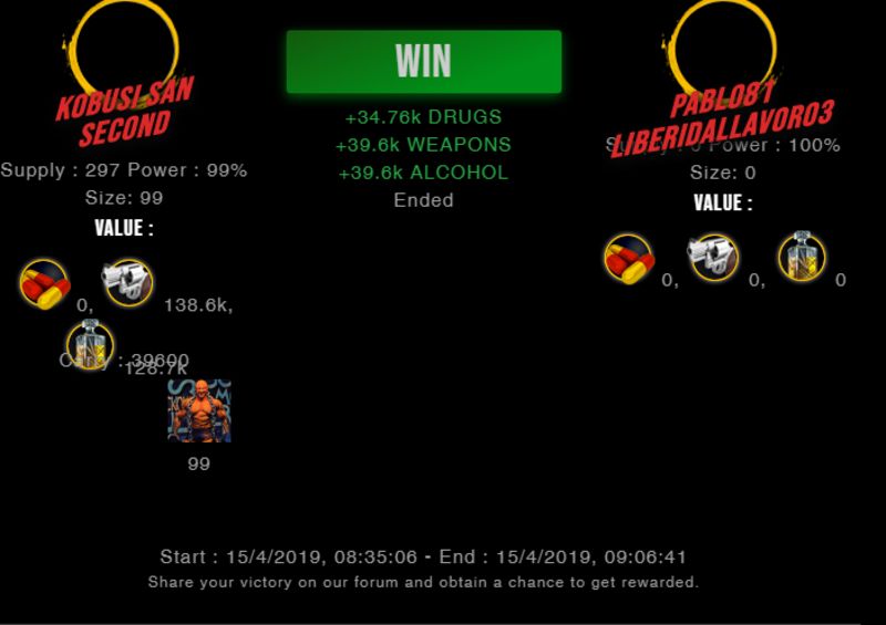 Check my latest fight ! kobusi san vs undefinedpablo81 (45)in #drugwars-fight • 7 years ago (edited)my gang its the best #gaming #fight #dw #ita