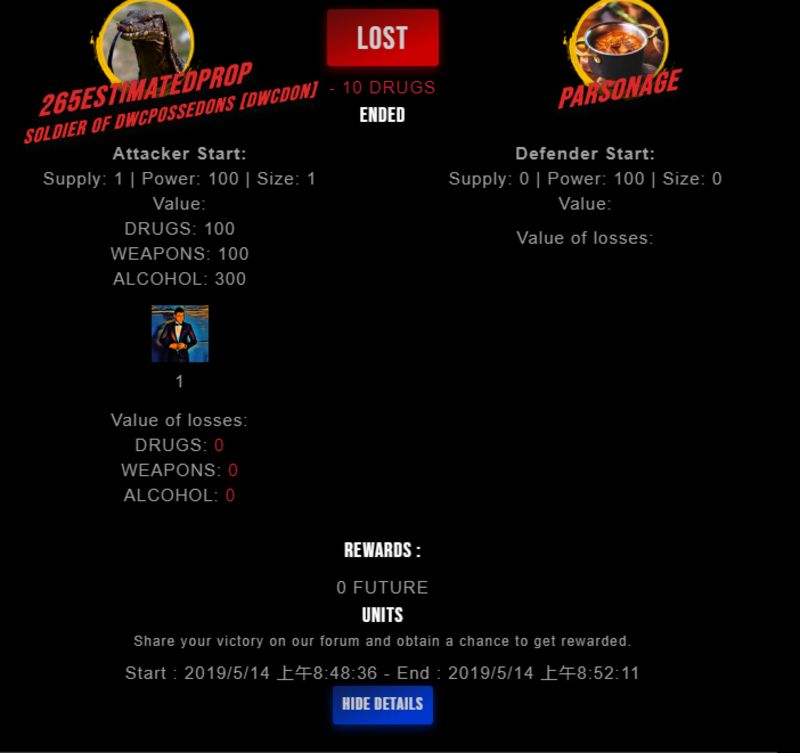 Check my latest fight ! 265estimatedpr0p vs parsonageparsonage (26)in #drugwars-fight • 7 years ago #gaming #fight #dw