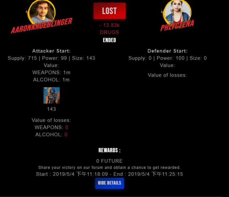 Check my latest fight ! aaronkroeblinger vs phlyctenaphlyctena (25)in #drugwars-fight • 7 years ago #gaming #fight #dw