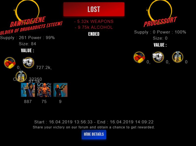 Congratulations @processort ! Your fight received an upvote of 5% from the Dealer as incentive for your activity and as a gratitude for your support to the game.