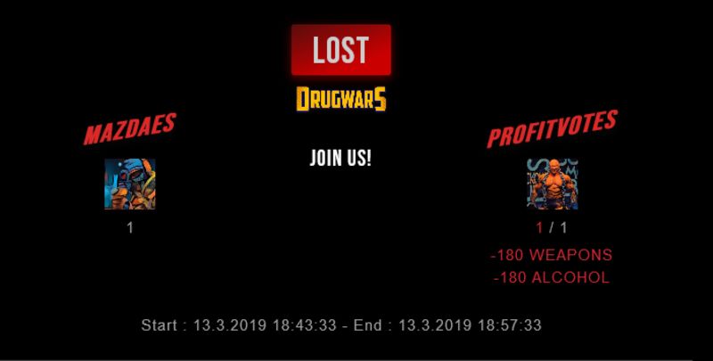 Check my latest fight ! mazdaes vs profitvotesprofitvotes (25)in #drugwars-fight • 7 years ago #gaming #fight #dw