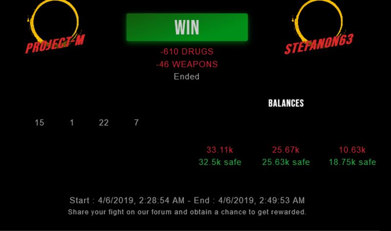 Check my latest fight ! project-m vs stefanon63project-m (45)in #drugwars-fight • 7 years ago #gaming #fight #dw