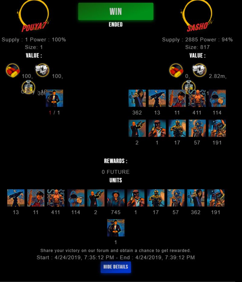 Congratulations @sasho ! Your fight received an upvote of 0.7% from the King Dealer as incentive for your activity and as a gratitude for your support to the game.