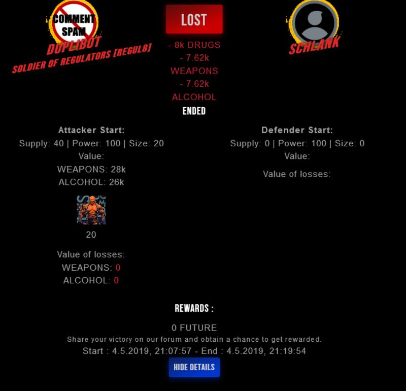 Check my latest fight ! duplibot vs schlankschlank (38)in #drugwars-fight • 7 years ago #gaming #fight #dw