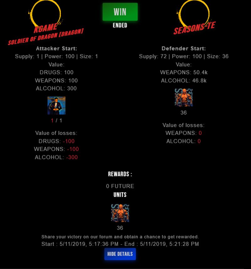 Congratulations @seasons-te ! Your fight received an upvote of 11% from the Dealer as incentive for your activity and as a gratitude for your support to the game.