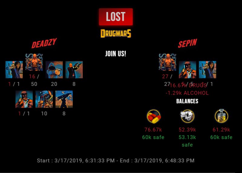 Congratulations @sepin ! Your fight received an upvote of 1% from the King Dealer as incentive for your activity and as a gratitude for your support to the game. Want to know more about DrugWars.io?