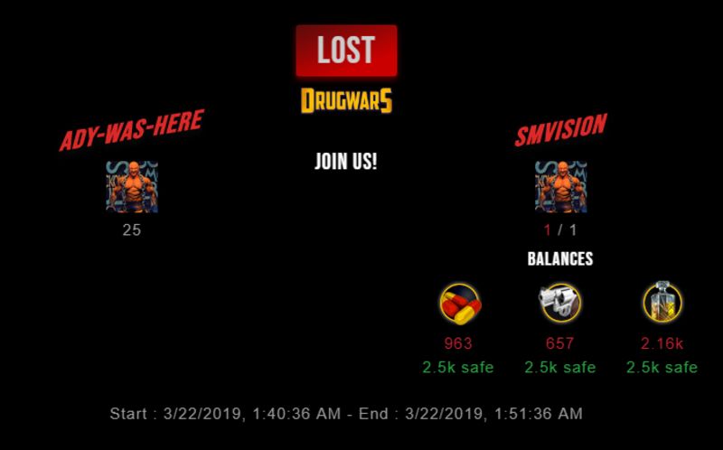 Check my latest fight ! ady-was-here vs smvisionsmvision (28)in #drugwars-fight • 7 years ago #gaming #fight #dw