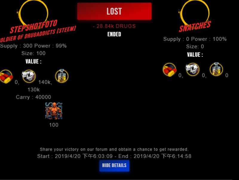Check my latest fight ! stepshotfoto vs snatchessnatches (29)in #drugwars-fight • 7 years ago #gaming #fight #dw